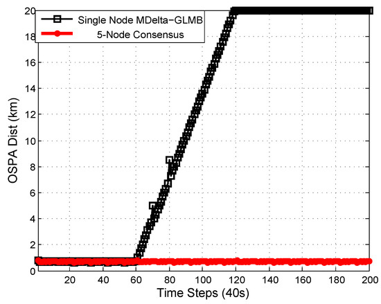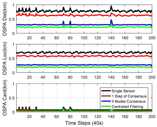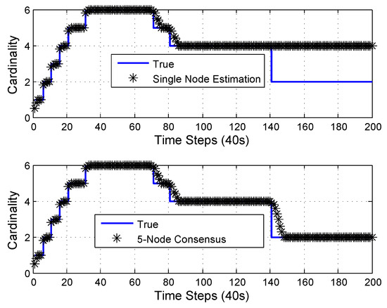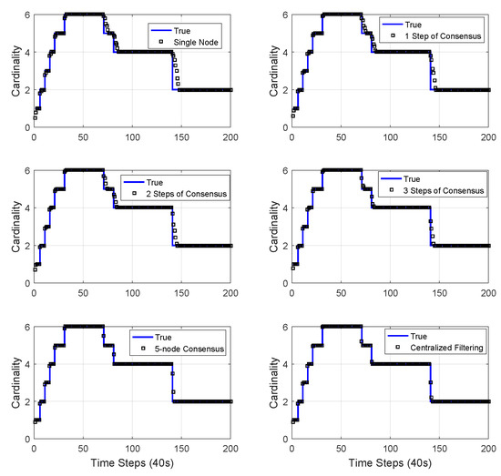 The numerical experimental results from a single sensor [48], 1-step consensus, 5-node consensus, and centralized M-GLMB filtering [48] are shown in Figure 8. Five-node consensus was the fusion procedure for all the information from five nodes. It is shown that the performance of 1-step consensus was better than single-node estimation. Since 5-node consensus uses information from all the nodes, it had better performance than 1-step consensus. Centralized M-GLMB filtering makes use of raw measurements from all sensors, and had the best performance.