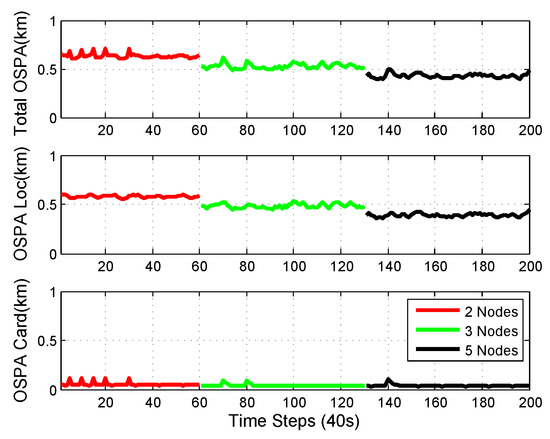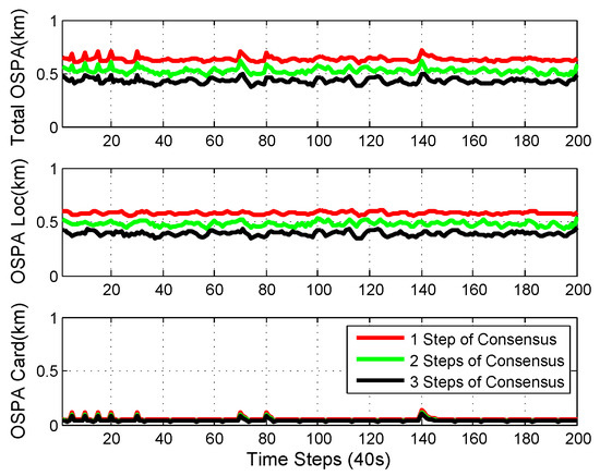 OSPA performance with different consensus steps is shown in Figure 9. It is shown in the figure that the OSPA performance was better with more consensus steps. With the designed network topology, the 3-step consensus had similar performance to the 5-node consensus. This is because it took 3 steps at most to transfer information from all of the other nodes to node3. After 3 steps of consensus, every node in the network had similar information, which is the average of the information from all nodes. There was no central node and the processing for each node was only carried among its neighbors, which makes the fusion scalable with respect to the size of the network.