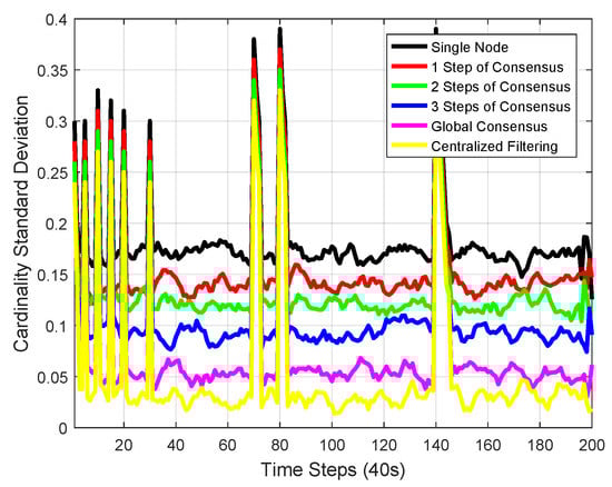 The mean and standard deviation of the estimated cardinality of single-node M-GLMB, 1-step consensus, 2-step consensus, 3-step consensus, 5-node consensus, and centralized M-GLMB filtering versus time are shown in Figure 10 and Figure 11, respectively. All filters estimated the cardinality accurately. The centralized M-GLMB filtering had the best cardinality estimation performance. Consensus with more steps showed better cardinality estimation.