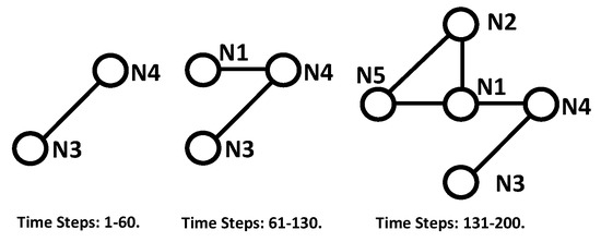 The network can also be time-varying because the processing is performed only among neighbors. The time-varying topology is shown in Figure 12, and the performance of the consensus algorithm is shown in Figure 13. Node3 and node4 were in the network from the start to the 60th time step. Node3, node4, and node1 were in the network from the 61st time step to the 130th time step. All five nodes were in the network the rest of the time. Carrying out consensus only among a node’s neighbors makes it possible for the method to handle a network topology that is time-varying.