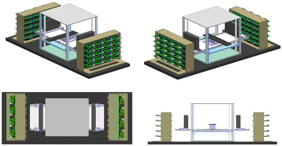 The P&I sensor modules described in the previous section were used to design a prototype PET monitoring system for proton therapy. Different views of the design are shown in Figure 4. The prototype consists of two flat panel PET heads composed of a P&I modules. The total area of each module is approximately cm2. The total number of LYSO/SiPM channels is 2880. The distance between the modules is adjustable and is set to 20 cm in this study. A central support is used to align the target volume with the detector system and place it at the center of the field of view (FOV). As the system is composed of 80 P&I heads, 40 MVT electronic boards are needed for the readout. A housing support for the boards is placed at both sides of the prototype. A fan cooling system is used to keep the temperature of the prototype stable. Temperature close to the chip is constantly measured, but we did not include a temperature feedback control for the system settings. The whole structure is mounted on a proton therapy patient bed, which can be fixed to the movable stage of the proton therapy room.