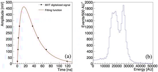 Response of a LYSO/SIPM channel after the detection of a 511 keV photon from a 22Na source. In (a) the MVT digitized signal (black points) and the fitted function reconstructing the original signal (red line) are shown. The fitted function is integrated within a time window of 200 ns and the distribution of its integral for a small sub-sample of 30,000 events is shown in (b): the photoelectric peak and the Compton continuum are visible in the obtained spectrum.