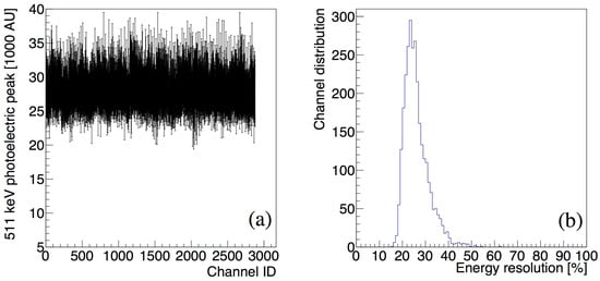 The position of the 511 keV photoelectric peak () measured during a 10 min 22Na calibration run in the 2880 detector channels is shown in Figure 7a. We registered a temperature fluctuation of approximately 1 °C (FWHM) during the acquisition. The error bars represent the width of the photoelectric peak. We observe that the position of the photoelectric peak ranges between 25,000 and 30,000 in all channels. The FWHM of the photoelectric peak is ranging between 5500 AU and 10,000 AU. The distribution of the energy resolution in the 2880 channels composing the proton therapy monitoring PET prototype is reported in Figure 7b. The SiPM/LYSO sensor channels with MVT readout show an average energy resolution (FWHM/) of approximately 24% with a variation (FWHM) of less than 5% across the system.