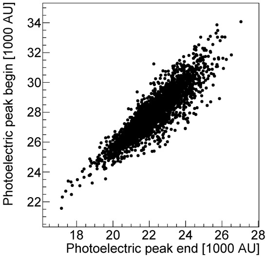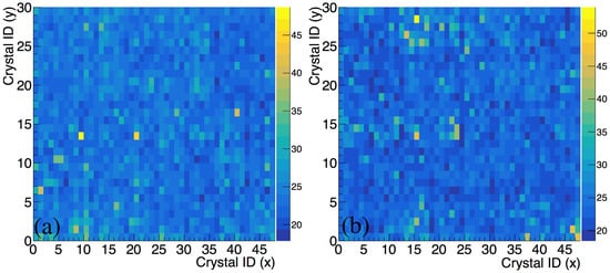 To verify the possibility to control the device in the experimental conditions of the proton therapy room, we plot the position of the 511 keV photoelectric peak taken at a time distance of ten hours in Figure 9. Each data point in the plot corresponds to one of the 2880 independent channels. We registered a temperature increase of approximately 10 °C close to the sensors between the two measurements. The position of the peak exhibits a reduction of approximately 15%. The gain and the photon detection efficiency of the SiPM are in fact decreasing with increasing temperature. We measure temperature variations between different runs up to 25 °C, depending on the working time period of the system.