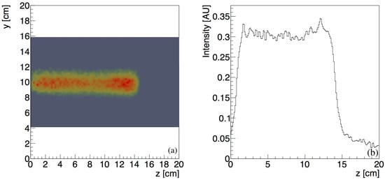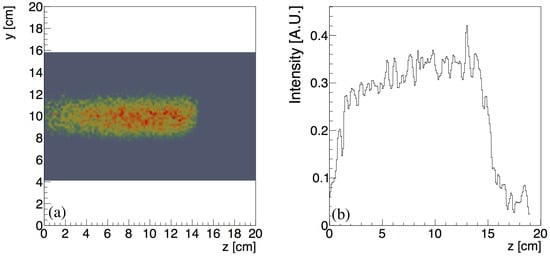 The reconstructed measured lateral profile of the positron emitters produced in the PMMA phantom after a 150 MeV proton irradiation is shown in Figure 10a. The width of the activity distribution in the y-direction perpendicular to the beam axis reflects the beam spot size, the scattering of the secondary particles produced in the target volume and the intrinsic experimental resolution of the detection system. The gray area corresponds to the reconstructed field of view. The one-dimensional profile of the induced positron activity along the beam z-axis at the central position cm is shown in Figure 10b.