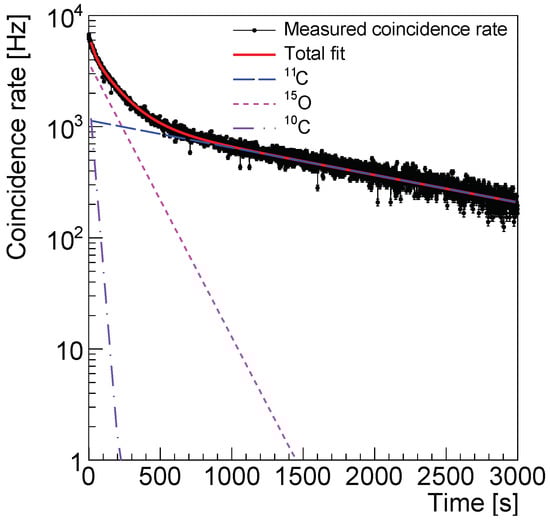 The measured coincidence rate is shown in Figure 11. The data points were fitted with the function in Equation (3). The total fitting function and each component are displayed in the plot. The fit results are reported in Table 2. The value of the half-life of the three positron emitters was estimated with a relative accuracy of approximately 0.5% and was found in good agreement with the literature values used in the simulation.