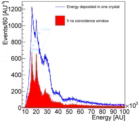 Histogram of the energy deposited in one of the crystals of the PET monitoring system during beam-on operation before (blue line) and after (filled red) 5 ns time coincidence.