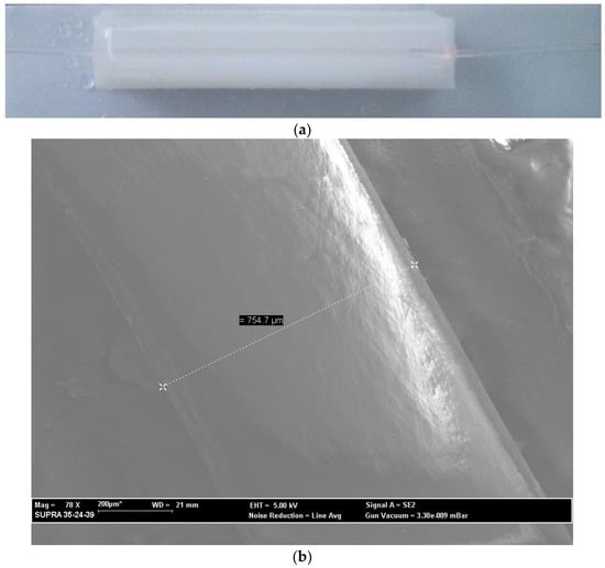 Figure 1a shows a picture of the sensor platform. The surface of the POF embedded in the block was polished with sandpaper of 22 µm (P800) with an “8-shaped” pattern about 30 times in order to remove the cladding and part of the core. We count the number of rounds on the polishing papers and, finally, we check the D-shaped area by SEM (scanning electron microscopy), as reported in [14]. A typical SEM image is reported in Figure 1b.