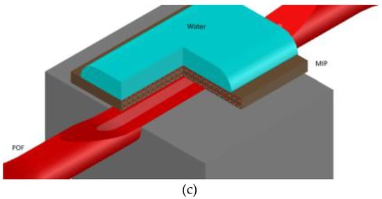 The sensing region of the optical platform with the MIP layer is represented in Figure 1c, with an interaction length of about 6 cm, whereas the estimated thickness of the MIP layer is less than one micron.