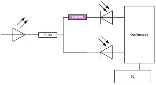 The intensity-based D-shaped-POF-MIP sensor has been characterized using a simple and low-cost experimental setup based on an LED, 627 nm (Avago SFH757V, Broadcom Limited, San Jose, CA, USA), an optical coupler (50:50), two photodetectors (Avago SFH250V, Broadcom Limited, San Jose, CA, USA), and a digital low-cost oscilloscope (Picoscope, Pico Technology, Cambridgeshire, UK) connected to a laptop, as shown in Figure 2.