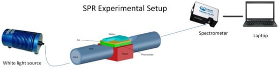 An SPR fiber sensor has also been used to compare the performance of the new approach with a “classic” plasmonic approach [9]. Figure 3 shows the SPR-POF sensor with the experimental setup. The plasmonic platform was realized as described in [9,26]. In this SPR sensor, the length of the sensing region is about 10 mm. The photoresist layer is 1500 nm thick and the gold film is 60 nm, presenting a good adhesion to the substrate too. In this configuration (SPR-POF sensor), we have used a more expensive “spectral interrogation” [9,26]. Here, the experimental setup consists of a halogen lamp (HL-2000-LL, Ocean Optics, Dunedin, FL, USA) illuminating the sensor and a spectrum analyzer (USB2000+UV–VIS spectrometer, Ocean Optics, Dunedin, FL, USA) connected to a computer, as shown in Figure 3. The spectral emission of the lamp ranges from 360 nm to 1700 nm and the spectrometer is sensitive from 300 nm to 1050 nm.