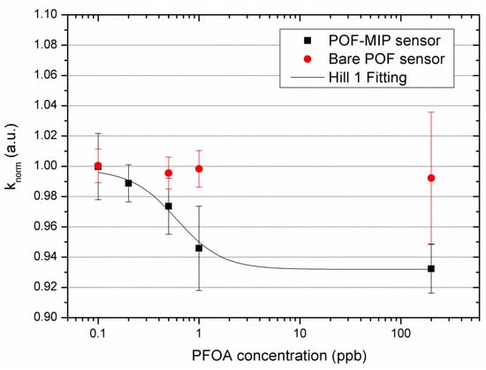 The parameter of the Hill equation (Equation (3)) corresponds to the reciprocal of the affinity constant of the specific sites of the Langmuir model, whereas the limit of detection (LOD) can be calculated as the ratio of three times the error of the blank () and the sensitivity at low concentration (). Table 3 shows the sensitivity at low concentration and the LOD of PFOA detection in water by a D-shaped POF-MIP intensity-based configuration.