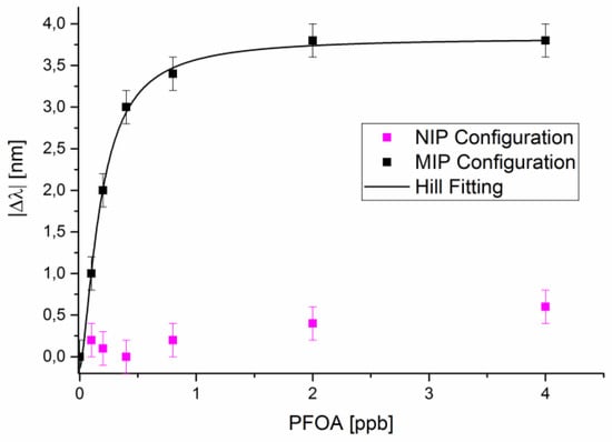 For both NIP and MIP configurations, Figure 5 reports the absolute resonance wavelength shift, (|∆λ|), with respect to the blank (PFOA 0 ppb), versus PFOA concentration (0–4 ppb), along with the Hill fitting to the experimental data for the SPR-POF-MIP configuration. Each experimental value is the average of five subsequent measurements and the respective standard deviations (error bars) are shown. When the PFOA concentration increases, for the SPR-POF-NIP configuration, the shift of the resonance wavelength is not present. For the SPR-POF-MIP configuration, the resonance wavelength shifts to smaller values when the concentration of PFOA in water solution increases. A shift like this means that when the PFOA interacts with the MIP receptor, the refractive index value of the MIP layer decreases [26]. This phenomenon is also present when the PFOA interacts with the antibody (bio-receptor) on the same SPR-POF platform [28].