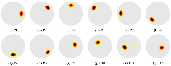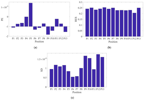 These three performance parameters (i.e., RES, PE, and SD) were computed for all 13 rod-position cases from P1 to P13 (Figure 2a) to evaluate the performance of the ECT algorithm. Figure 4 shows each of the evaluation criteria results calculated for each rod position, while Table 1 summarizes the statistical properties of each criterion considering all positions. In general, smaller standard deviations indicate better accuracy of reconstructed images in terms of the rod’s location, shape, and size. Even though the magnitudes of PE are very small over the entire ECT electrode array (Figure 4a), their bipolar distribution suggests that reconstructed images are sometimes pushed towards or away from the center of the sensing domain. The slightly larger values of RES indicate that the ECT algorithm tends to overestimate the size of the target object (Figure 4b). The smoothing effect of the regularization scheme used in this study may contribute to this overestimation. Despite this, the incredibly small values of SD (i.e., on the order of 10−4) and its small standard deviations indicate the low risk of incorrectly interpreting the reconstructed permittivity maps, thereby successfully validating its position-detection robustness. In summary, these results successfully validated the ECT system, where the locations, shapes, and sizes of permittivity changes was visualized fairly accurately.