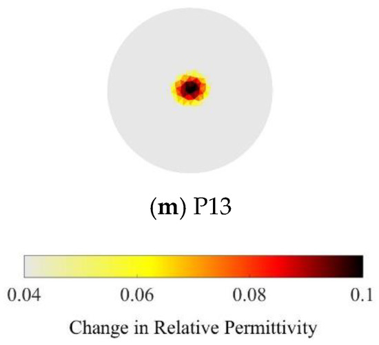 The ECT images were determined when the PVC rod was placed at (a) P1, (b) P2, …, to (m) P13.