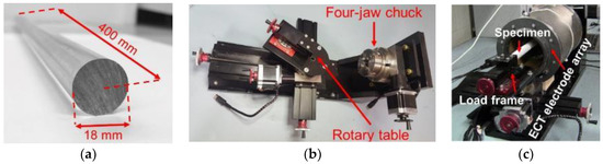 After quantifying the accuracy of the ECT inverse algorithm, a set of experiments was performed to verify if deformation in the prosthesis phantom could be monitored in a noncontact fashion via ECT. A 20 mm-diameter plastic rod (Figure 5a) was used as the prosthesis phantom and subjected to uniaxial and bending loads, while its change in electrical permittivity due to strain/deformation was monitored with ECT. Although a plastic rod was used, it could be replaced with a metallic specimen. A previous study by Gupta and Loh [36] demonstrated that ECT could also detect strain-induced permittivity changes of a nanocomposite-coated metallic prosthesis phantom.