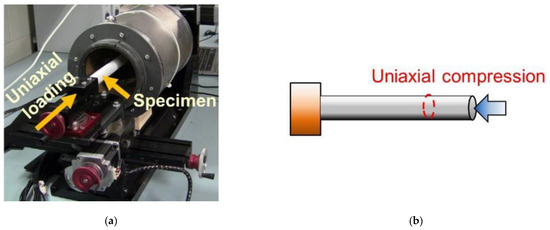 (a) The picture of the load frame and (b) the schematic shows that uniaxial compressive load was applied to the test specimen, and ECT measurments were recorded at different strain states.