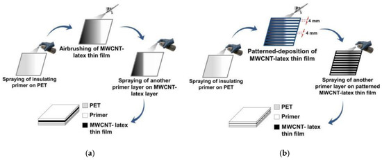 The fabrication procedure for (a) Thin film-A and (b) -B are illustrated. MWCNT—multi-walled carbon nanotube; PET—polyethylene terephthalate.