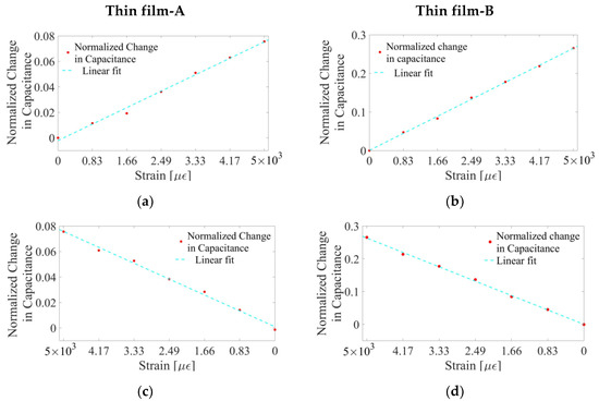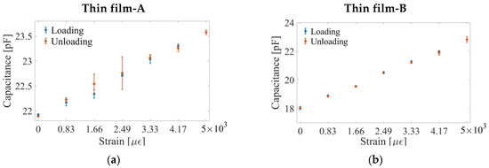 Figure 10a,b show the average capacitances of the Thin film-A and Thin film-B parallel-plate capacitors, respectively, during loading and unloading. Although the results shown here were obtained from only one loading cycle, it can be observed that the capacitance corresponding to the same strain-state during loading and unloading is nearly identical, which demonstrated their repeatability and suitability for strain sensing. However, it is important to study the long-term electromechanical behavior of the nanocomposite thin film to establish this thin film as a reliable strain sensor for OIP monitoring. In a previous study done by Wang and Loh [45], 5-, 10-, and 15-tensile cyclic strain patterns were applied, and the resistance of the film was simultaneously measured. Although the thin film exhibited cyclic changes in its electrical property in tandem with the applied cyclic strain pattern, the nominal resistance of the film drifted, and it took a very long time to stabilize (>30 min). Thermal annealing could be applied to avoid such drifts in nominal resistance of the thin film.