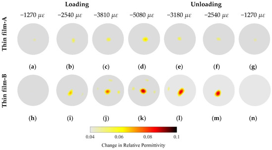 Thin films-A and -B coated onto osseointegrated prostheses phantoms were subjected to transverse loading. The corresponding changes in electrical permittivity with respect to the undeformed states are shown. (a–g) describes the permittivity changes for the specimen coated with Thin film-A, while (h–n) illustrate the electrical permittivity changes of the Thin film-B-coated specimen.