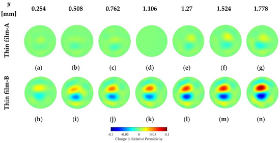 It is known that bending of a cantilever beam induces tension in one side with respect to the neutral axis and compression in the other. In this study, the custom Elintrix load frame was adjusted to apply transverse displacements (y) or loads to the free-end of the film-coated OIP phantoms, as was discussed earlier. Loading was paused at different displacement intervals to allow the ECT system to interrogate the sensing region and the specimen. Figure 13 shows a representative set of results. Although no significant changes in electrical permittivity were observed near the central region when a Thin film-A-coated specimen was subjected to bending (first row of Figure 13), a bipolar change in electrical permittivity was observed in the Thin film-B-coated specimen (bottom row of Figure 13). The reason that only the Thin film-B-coated specimens produced a response was because of its higher strain sensitivity and larger signal-to-noise-ratio. The bipolar response was also expected (i.e., given that the rod was simultaneously experiencing tension and compression), and these results validated the fact that the film could sense both tensile and compressive strains when coupled with ECT. However, the size of the specimen was exaggerated by ECT, which could be because of the particular regularization scheme employed. This is also expected because previous tests revealed larger RES errors in the reconstructed images.