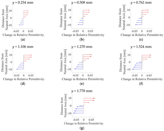 The change in electrical permittivity in R at different distances from the neutral axis position (i.e., the center of the OIP surrogate) corresponding to different y are plotted in (a–g).