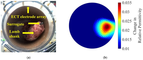 (a) The lamb shank with an embedded prosthesis phantom was scanned by the ECT electrode array. (b) The change in electrical permittivity distribution with respect to the empty baseline of air (i.e., empty ECT electrode array) is presented.