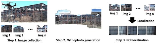 System overview: Step 1. Image collection—collecting many close-up images to cover the entire area of a building façade under various viewpoints, Step 2. Orthophoto generation—constructing an orthophoto of the building façade and computing a geometric relationship between the constructed orthophoto and each image, and Step 3. Regions-of-interest (ROI) localization—extracting the ROIs from the images.