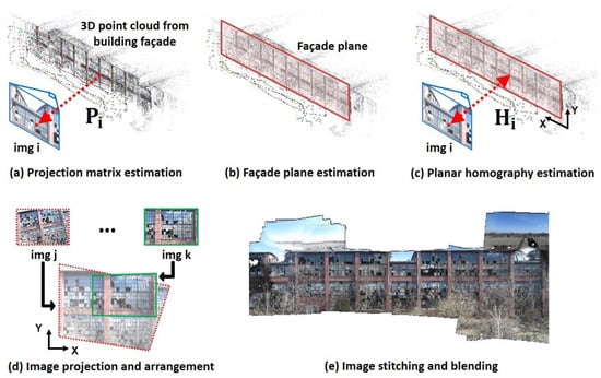Overview of the orthophoto generation: (a) Projection matrix estimation for each image using structure-from-motion (SfM) technique, (b) Façade plane estimation from a 3D point cloud, (c) Planar homography estimation from corresponding projection matrix, (d) Image projection and arrangement into the estimated façade plane (parallel to the XY-plane), and (e) Image stitching and blending to generate the complete orthophoto.