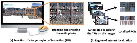 Step 1 is to fly the UAVs over the TBF to collect a large number of high-resolution images. To increase the likelihood of detecting damage, these images are captured from many different viewpoints and positions [19,21,22,23]. The entire region of the building façade that is needed for inspection should be covered by the images. Step 2 is to generate an orthophoto of the TBF from the collected images. The SfM technique is used to estimate the geometric relationship between each image and the TBF. By extracting and matching the visual features, this process conducts calibration of the camera parameters for each image including a projection matrix and radial distortion coefficient(s) as well as generating a 3D point cloud of the scene [24,25,26]. The surface of the TBF can be automatically detected by fitting a plane to the 3D point cloud. Then, the orthophoto is constructed by projecting each image onto the detected plane, followed by stitching and blending them. Lastly, in Step 3, the ROIs corresponding to the TRIs that the engineers select for inspection are extracted from the original images. The geometric relationship with each of the selected TRIs on the orthophoto and the original images is used to localize the corresponding ROIs. Since the localized ROIs are a set of image patches cropped from those images, they contain detailed visual information of the TRIs. Thus, the extracted ROIs enable robust vision-based visual assessment of the facades. Both the orthophoto generation and ROI extraction are developed to be fully automated without the need for manual manipulation. The only manual step is associated with the TRI selection on the orthophoto in Step 3.