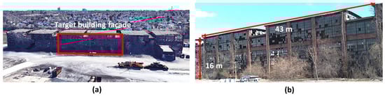 To demonstrate and validate the capability of the method developed herein, a building with severe façade damage (Figure 4) is utilized to reproduce the typical scenario of post-event building evaluation. This steel frame building is covered with window panes and masonry cladding on its TBF. The building is located in West Lafayette, IN, USA (GPS: 40.444922, −86.876579), and was originally built in 1925 as a railroad warehouse but has been abandoned since 1996 [30]. Thus, cracked or broken window panes, tiles and external drain pipes remain unfixed and untrimmed trees obstruct their views. The size of the façade of the test building is roughly 128 × 16 m2, but in this demonstration we only collect images from the center sections of the façade marked in Figure 4a. The size of the TBF is 43 × 16 m2 in Figure 4b. Window panes in the façade are opaque with an identical size of dimension 25.4 × 300 × 3 mm3.