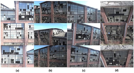 In our experiment, suitable UAV flight paths are designed based on the guidelines established in Section 2.1. First, images are collected by flying the UAV along a grid pattern. During this process the UAV must first maintain a set altitude (vertical direction) and flies from one side to the other, and then repeats this process after changing its altitude. Image acquisition along this pre-designed flying path is assured to have sufficient and consistent overlap between the images in both the horizontal and vertical directions and to also capture the entire test façade. Second, the UAV must also maintain a constant and low flying speed to avoid abrupt transitions. Rapid transitions between the images will produce insufficient overlap between images and also makes the images blurry. The flying speed is determined based on the distance between the UAV and the test façade, the camera’s field of view (FoV), and the image collection rate. In this experiment, the distance is set to roughly 4–5 m to capture the detailed appearance of the test façade. The FoV and image capture rate of the camera are around 90° and one frame per second (1 frame/s), respectively. Accordingly, the flying speed is determined as 0.5–1 m/s to produce more than 60% overlap between images. Third, angled images must be collected from four different viewpoints. Sample angled images and parallel images are provided in Figure 6. In this experiment, we fly the UAV four times after changing the angles of the camera (parallel, right-and left-angled, and downward).
