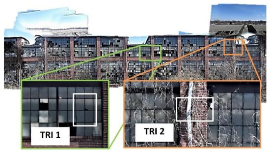 Figure 7 shows the constructed orthophoto of the TBF and a selection of sample TRIs. In this study, we choose two TRIs using rectangular boxes, denoted as TRI 1 and TRI 2. TRI 1 and TRI 2 include a broken window pane with a hairline crack and a cracked external drainage pipe, respectively. Although only two TRIs are chosen for this experimental validation, multiple regions with any sizes and locations may be selected with the technique developed. Note that the orthophoto is only used for assigning the TRIs. We recommend that further documentation and the actual inspection is conducted using the ROIs extracted from the original high-resolution images.