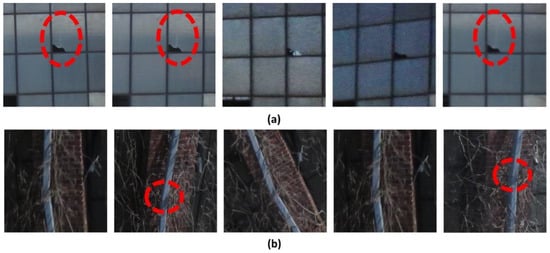 Five samples of localized ROIs corresponding to each TRI are presented in Figure 8. The number of extracted ROIs corresponding to the two TRIs is 22 and 27 (from a total of 1254 images), respectively. All ROIs have different resolutions and aspect ratios depending on the depth between the images and TBF and viewing angles. However, in Figure 8, they are transformed into a square for this arrangement. These ROIs do satisfy the two conditions introduced in Section 2.3. Since the ROIs include details and multiple viewpoints of the TRIs, reliable vision-based visual inspection can be achieved. For instance, in Figure 8a, the white vertical crack propagated from the broken region is only visible in the specific ROIs captured from certain angles. Similarly, in Figure 8b, the break in the drainage pipe is only identified when the corresponding region is not impeded by the branch. The images that are captured with an angle are helpful in identifying such damage. These two examples clearly illustrate the need for collecting a sufficient number of images from different viewpoints and localizing the high-resolution ROIs from the original images for conducting robust visual evaluation.