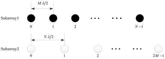 As illustrated in Figure 1, consider the coprime arrays which are composed of two uniform linear subarrays. One includes N sensors with inter-element spacing , while the other owns sensors with inter-element spacing , where is the wavelength of the received signal. As described in Section 1, M and N are coprime integers. Without loss of generality, we assume that M is less than N. The two subarrays share the zeroth sensor, which is also the reference sensor. Thus, the total number of sensors in the coprime arrays is , which are located at