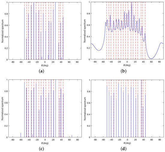 In this subsection, the detection performance of the proposed method is compared with that of the methods OGSBI, LASSO and LRD. All of these methods can detect more sources than sensors with using coprime arrays. In theory, LRD can only identify at most 17 sources under the coprime arrays set above. Therefore, for convenience of comparison, we consider 17 randomly distributed narrowband uncorrelated sources here, which are located at , , , , , , , , , , , , , , , and . The number of sampled snapshots is 800 and the Signal-to-Noise Ratio (SNR) is set as 0 dB. The scale factor is 0.5. The spatial spectra of the four algorithms are shown in Figure 2a–d, respectively. In these figures, the red dashed line indicates the true direction of the incident signal, and the solid blue line indicates the estimated spectral line.