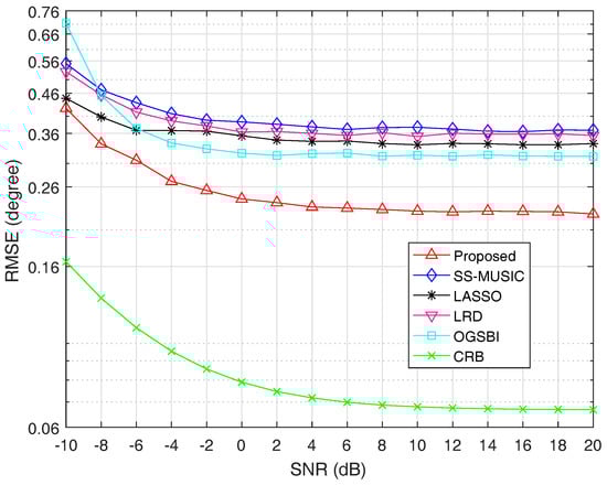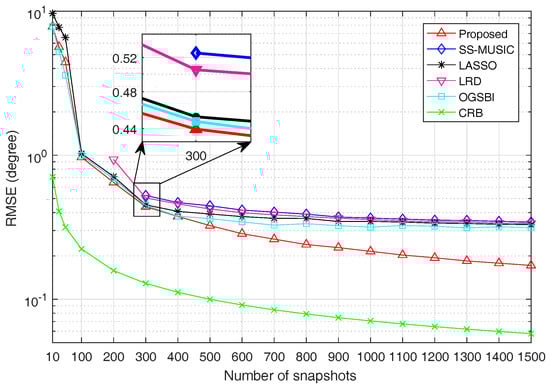It is obvious from Figure 5 that the estimation accuracy is improved with the increase of snapshots for all algorithms. For the same reason as described above, the estimation performance of SS-MUSIC, LRD, LASSO and OGSBI is inferior to the proposed method. It can be seen from Figure 5 that when the number of snapshots changes from 10 to 1500, the estimation accuracy of the proposed method is getting better and better than the other four algorithms and finally outperforms the other four algorithms notably by a large margin.