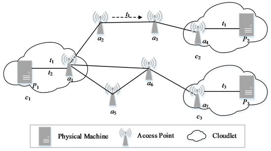 Figure 1 shows an example of cloudlet layout in the WMAN. The cloudlets are connected by the APs and deployed in the WMAN. There are seven APs, three physical machines, three cloudlets and three computing tasks in the example. The cloudlet c1 is connected to the cloudlet c2 through four APs, named a1, a2, a3 and a4. If the IoT data of the computing task t1 has privacy conflicts with the other data, t1 will be migrated to the cloudlet c2 for processing, through a1, a2, a3 and a4. In addition, the cloudlet c1 is connected to the cloudlet c3 through three APs, named a1, a6 and a7 or through APs of a1, a5, a6 and a7.