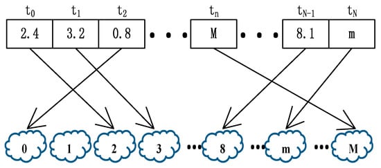 Figure 2 shows the value of each gene in a chromosome. Suppose that the n-th task tn will be assigned to M cloudlets for execution. Then, the length of this chromosome Xj is N, and each gene will be a real value between 0 and M. However, in the calculation, each real value will be converted into an integer that represents the position of the execution cloudlet. For example, in Figure 2, the second task t1 has a gene value of 3.2, and adopts the “down rounding” method, so the task t1 will be assigned to cloudlet 3 for execution.