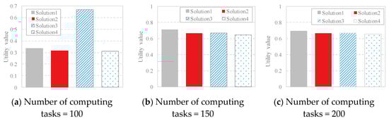 where , T(X) and E(X) represent the fitness of the data offloading strategy xi regarding the three objective functions mentioned above, respectively. max and min represent the maximum and minimum fitness values for the resource utilization. If max = min, let . Analogously, Tmax and Tmin represent the maximum and minimum fitness for the data transmission time, and if Tmax = Tmin, let ; Emax and Emin represent the maximum and minimum fitness for the energy consumption, and if Emax = Emin, let . Figure 3 shows the comparison of the utility value of the solutions generated by IOM with different task scales. It is illustrated that when the task scale is 100, 150 or 200, four solutions are generated by IOM. For the solutions generated by IOM, we attempt to obtain the most balanced data offloading strategy by evaluating the utility value given in (17). After statistics and analysis, the solution with the maximum utility value is considered as the most balanced strategy. For instance, in Figure 3a, the final selected strategy is solution 3 because it achieves the highest utility value.