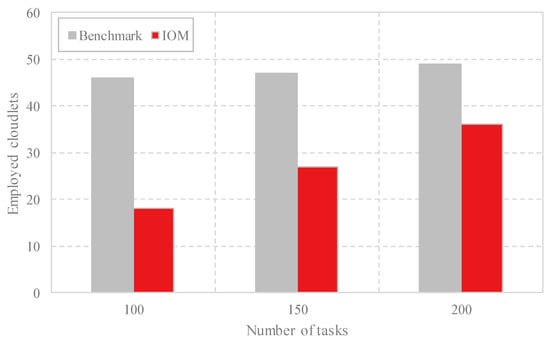 Comparison of the number of the employed cloudlets with different task scales by Benchmark and IOM.