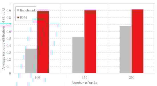 (2) Comparison of the resource utilization: After offloading all the computing tasks to the cloudlets via the data offloading methods, the occupation of the VMs is achieved. Figure 5 shows the comparison of the resource utilization of the cloudlets by using Benchmark and IOM with different task scales. The resource utilization is calculated according to the number of occupied cloudlets and the employed VMs in each cloudlet. Fewer employed cloudlets with more employed VMs contribute to a higher resource utilization. It is intuitive from Figure 5 that IOM achieves higher and stable resource utilization. That is, IOM reduces the number of unemployed VMs and wastes less resources than Benchmark.