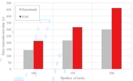 Comparison of the data transmission time with different task scales by Benchmark and IOM.