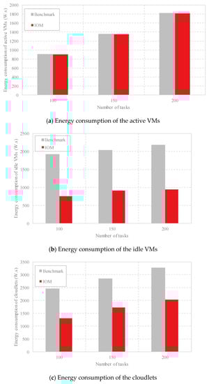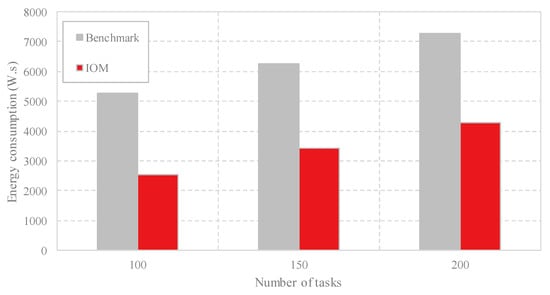 (4) Comparison of the energy consumption: As outlined in Section 2, the energy consumption is composed of the energy consumption of the active VMs, the energy consumption of the idle VMs, and the energy consumption of the cloudlets. In Figure 7, we compare these three aspects respectively with different task scales. As shown in Figure 7a, both methods achieve the same energy consumption of the active VMs at the same task scale because the same number of VMs are employed by Benchmark and IOM. Figure 7b shows that as the number of computing tasks increases, both methods increase the energy consumption of the idle VMs, but IOM generates less energy of the idle VMs due to less unemployed VMs used compared with Benchmark by occupying fewer cloudlets. Figure 7c indicates that IOM consumes less energy of the cloudlets than the Benchmark. The comparison of energy consumption in Figure 8 shows that IOM has better performance. For example, when the number of computing tasks is 100, IOM achieves a power consumption of less than 3000 W.s, whereas Benchmark generates more than 5000 W.s energy.