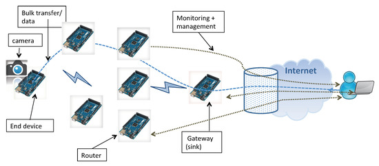 The critical issue addressed in WSNs often relates to energy efficiency. Solutions have been proposed for fixed patterns of communication, such as collecting low frequency sensor measurements [1]. However, another opposite communication pattern is the bulk transmission characterising for instance the family of Wireless Multimedia Sensor Networks (WMSNs) [1,2,3,4]. The latter have shifted the focus from the typical scalar WSNs to networks which deliver multimedia traffic as video, audio, still image in addition to scalar data. The promising application fields are numerous [1], such as smart cities including areas monitoring, missing persons locating, etc.