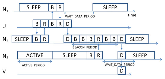 Applying the duty cycle for sensors [5,6] means alternating between active and sleep states while favoring the sleep state as much as possible. Obviously, such a design saves energy by avoiding idle listening, collisions and traffic overhead generation [7,8]. The duty cycle can be either synchronous or asynchronous. The first category implies clock synchronization and coordination between nodes to set their schedule. An example of framework for synchronous duty cycle is the work of the 6TiSCH (IPv6 over the Time Synchronized Channel Hopping mode of IEEE 802.15.4e) working group [9,10] from the IETF (Internet Engineering Task Force). According to 6TiSCH, communications are coordinated based on a slotted time division multiple access (TDMA) with frequency hopping. In contrast, in asynchronous design, sensor nodes wake up independently and perform “online” sender-receiver coordination.
