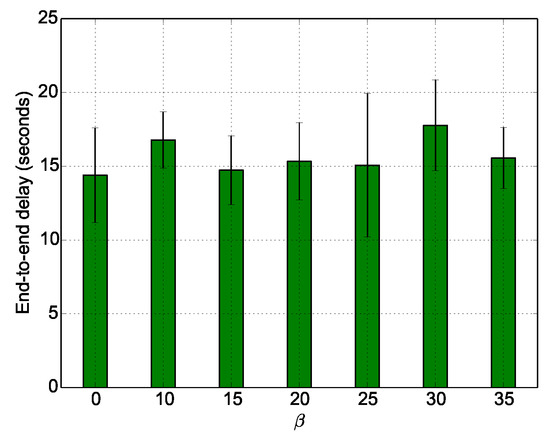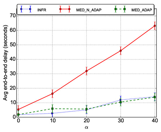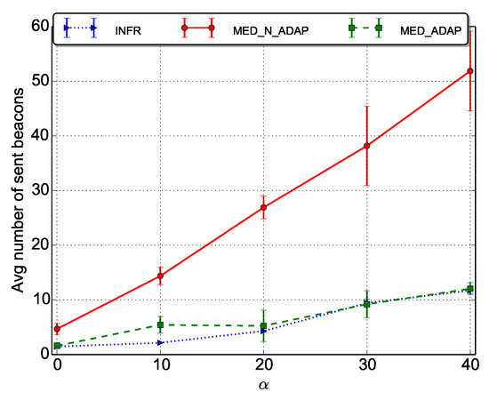 As depicted in Figure 8, the delay plots follow the beacon overhead plots (see Figure 4) as the beaconing process is basically a source of packet forwarding delays. The end-to-end delays vary linearly with . The scenarios MED_ADAP and INFR have low end-to-end delays that slightly increase with . This witnesses a good trade-off between energy saving and delay reduction. In MED_N_ADAP, delays are rapidly increasing with .