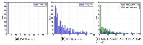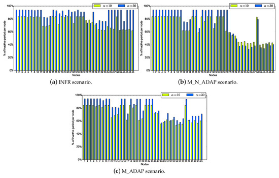 Another observation from Figure 10, is that, as expected, INFR scenario ensures the highest values of the duty cycle. The average duty cycle increases with for INFR scenario, while it is almost insensitive to for MED_N_ADAP and MED_ADAP. We evaluate the duty cycle of each node in Figure 11 for and .
