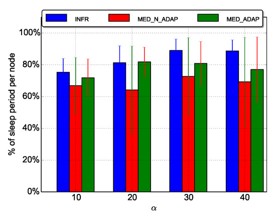 Selecting a random sleep period in the I interval, with the parameters of Table 1 and for for instance, any node would sleep an average period approximated by ms, in MED_N_ADAP. Which leads to a sleep ratio equal to: . Experiments yield an average value .