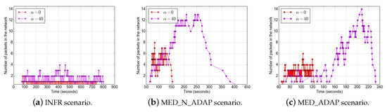 We compare two values of : 0 and 40. In the INFR scenario, the number of packets in the network oscillates very much; as the packets generation rate is low, their total number rapidly decreases in the network (maximum number is equal to 4 packets distributed over all nodes). The plot with reaches higher amplitudes and higher width than the plot with in all scenarios. The difference in amplitude is due to the network congestion and to the duty cycle. However, the number of packets is the network oscillates less in MED_N_ADAP scenario and it reaches its maximum values before starting to decrease. This means, as highlighted above, that some packets are more blocked in this scenario than in MED_ADAP scenario. Also, higher values of increase the packets sojourn time in the network leading to higher end-to-end delays; which is shown by the larger width of the plots for .